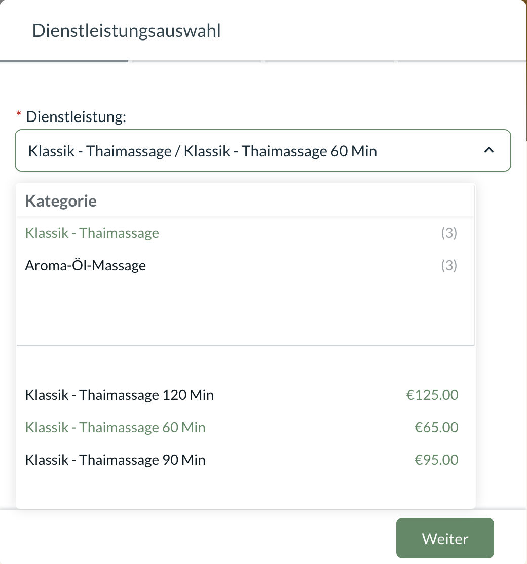 Deine Kunden können ganz bequem aus deinem Leistungsangebot wählen und direkt online buchen. Der gesamte Prozess – von der Auswahl der passenden Kategorie über die Anzeige aller verfügbaren Leistungen bis hin zur sicheren Online-Bezahlung – ist übersichtlich, intuitiv und in wenigen Sekunden erledigt.
