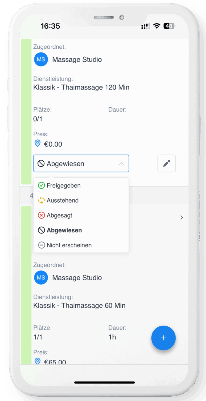 Du siehst auf einen Blick alle Buchungen, deren Status und alle wichtigen Details. Änderungen wie „Freigegeben“, „Abgesagt“ oder „Ausstehend“ nimmst du mit nur einem Klick vor. Bei jeder Statusänderung wird automatisch die passende Nachricht an deinen Kunden gesendet – ganz ohne dass du selbst daran denken musst. So behältst du jederzeit die volle Kontrolle und kannst deine Abläufe effizient und flexibel organisieren – egal, wo du gerade bist.
