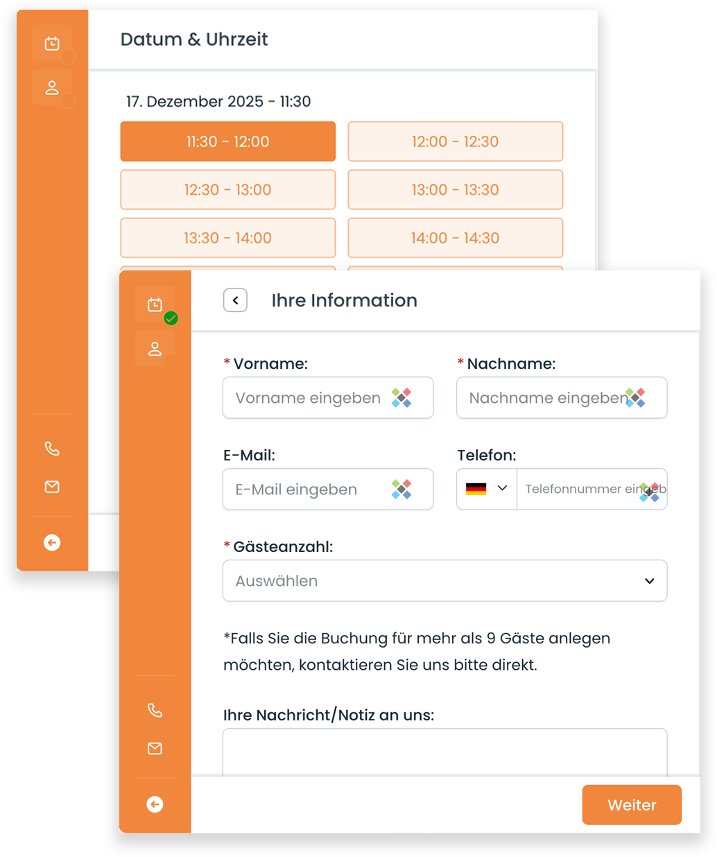 Ein Reservierungserlebnis, das begeistert: Mit nur wenigen Klicks wählen deine Gäste den passenden Zeitraum aus und tragen ihre Daten ein. Der Kalender zeigt jederzeit übersichtlich an, welche Zeiten verfügbar sind – so finden Gäste sofort den idealen Slot. Die Eingabe ist simpel, schnell und für alle Geräte optimiert. In weniger als einer Minute ist die Reservierung abgeschickt – ganz ohne Anruf, ohne Wartezeit und ohne Rückfragen.